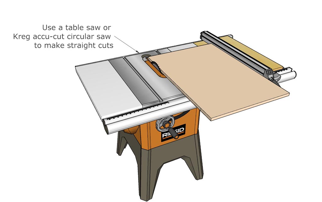 Start by dimensioning the largest pieces on the sheet of plywood as shown on the cut list layout. The placement and orientation of the pieces on the cut list have been designed to reduce material waste.