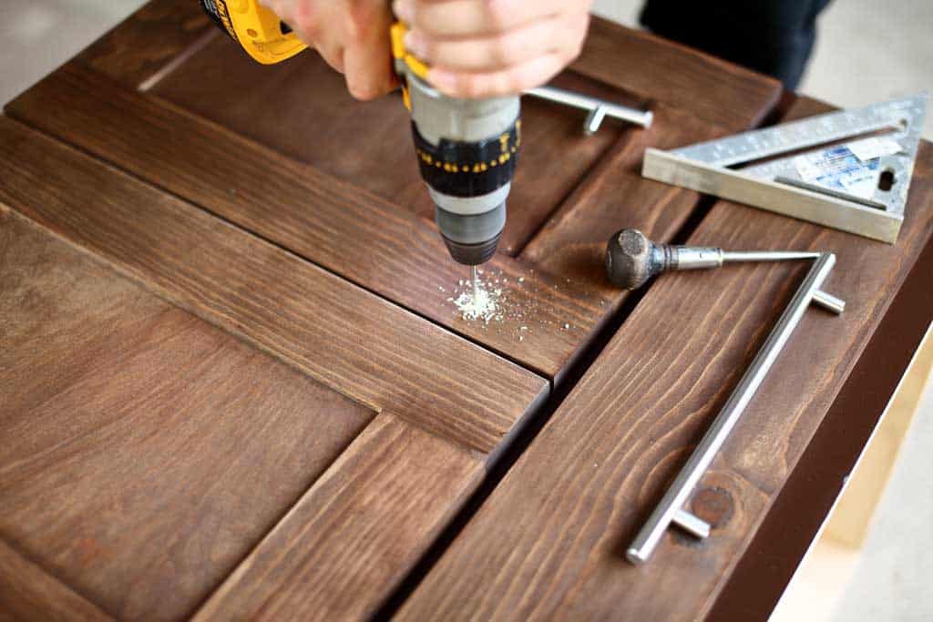 To install the hinges on the doors, you will need a 1 3/8″ by 3/8″ Shank Forstner Drill Bit. Take the door and measure 4″ from the bottom and 4″ from the top and mark it with a pencil. The hinges you purchase usually come with a template. Place the template at the 4″ mark and with a scratch awl or a nail, push down through the template x marks to make a little dent in the door. Remove the template and drill a 1 3/8″ hole at the center of the mark using shank Forstner drill bit. You only need to drill these holes on two of the doors; the third door will be used as a drawer so it does not need hinges.