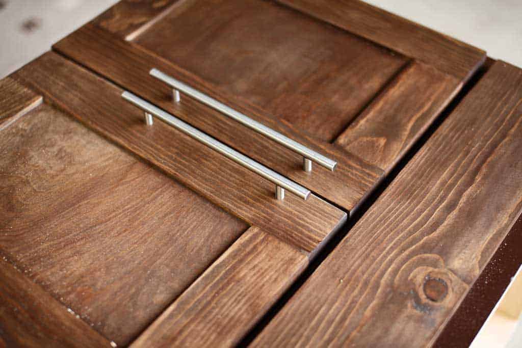 Right above the cabinet drawers attach a 28″ x 5 1/2″ decor board, using 1 1/4 brad nails from the inside, with a nail gun. Then attach door handles to the cabinet doors.