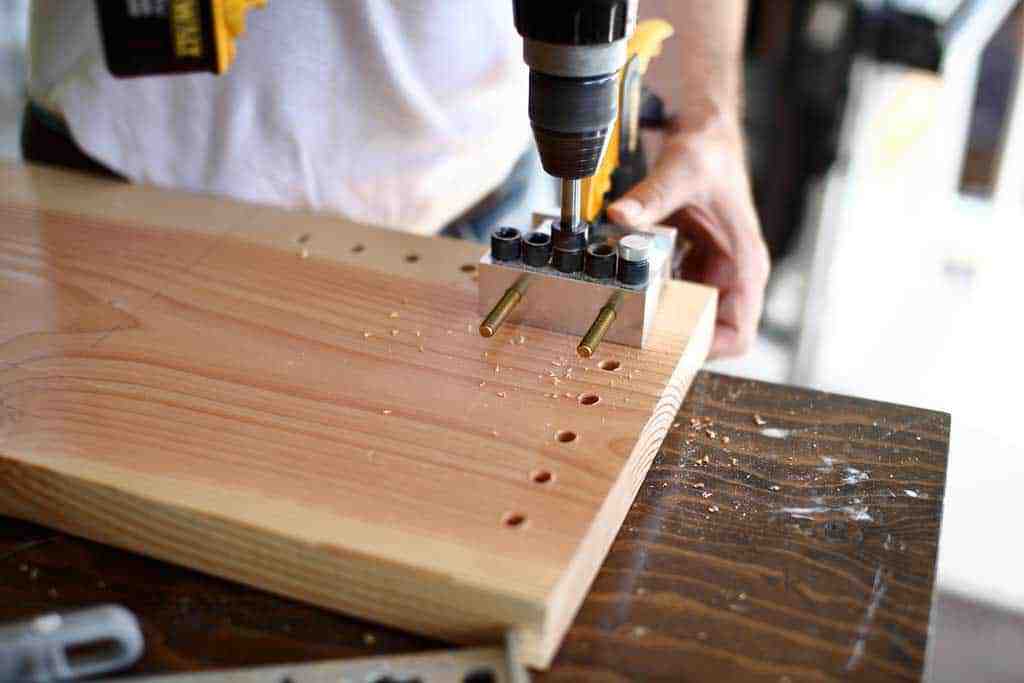 At the time of this project, I didn’t have a drill press, so I used a Dowelmax Jig. Dowelmax jig is used for joining wood boards together with wood glue and dowels. You clamp the jig to the board and drill a 3/8″ hole for inserting the dowel. The Dowel jig holds the drill bit straight and allows you to drill a perfectly straight hole. So I used this jig as an alternate to the drill press.