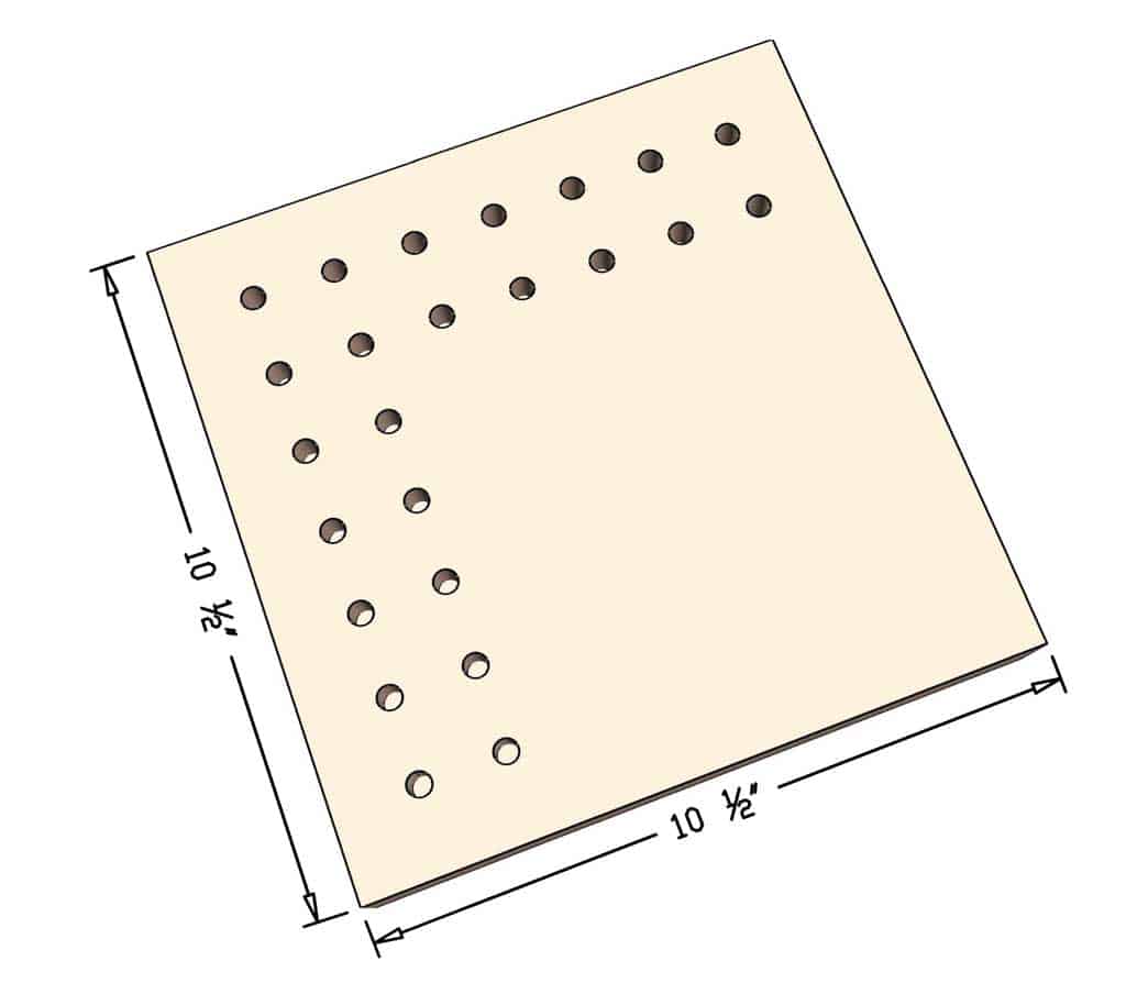 Measure the distance from the left side edge of the board to the first hole. Then transfer that measurement from the 7th hole to where the right side edge should be. Using a table saw cut off the extra wood on the right side. Do the same thing on the bottom. Now you should have a perfectly squared 10 1/2″ x 10 1/2″ board with top and left holes drilled.