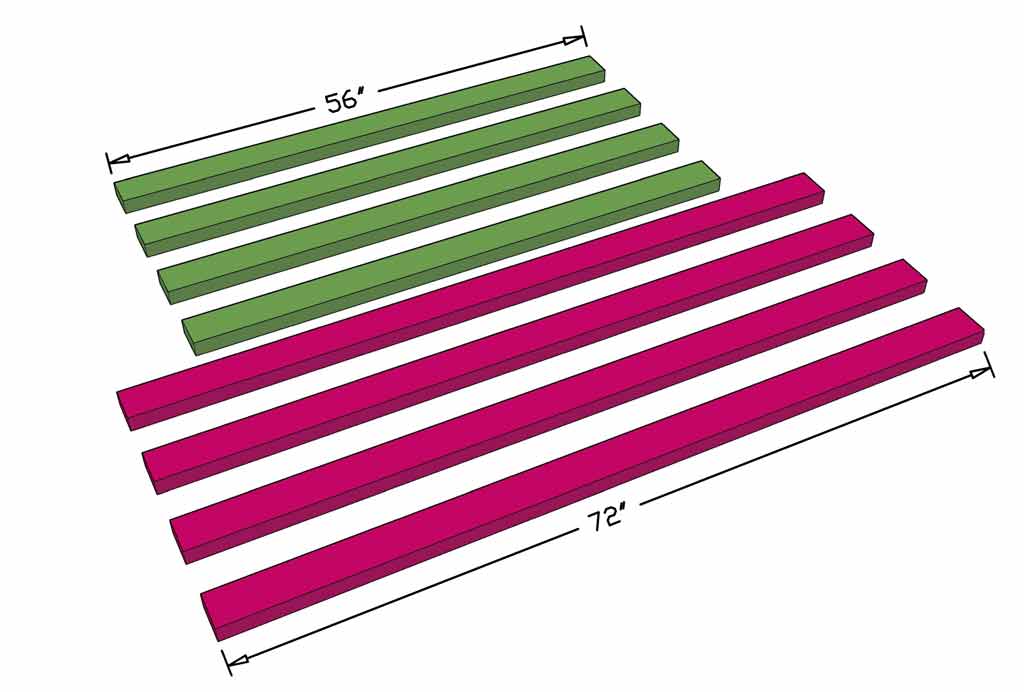 First, start with cutting the legs. Using 2x4s, cut four pieces to 72″ in length. Then cut another four 2×4 pieces to 56″ in length. These shorter pieces will support the weight of the loft bed, including the mattress.