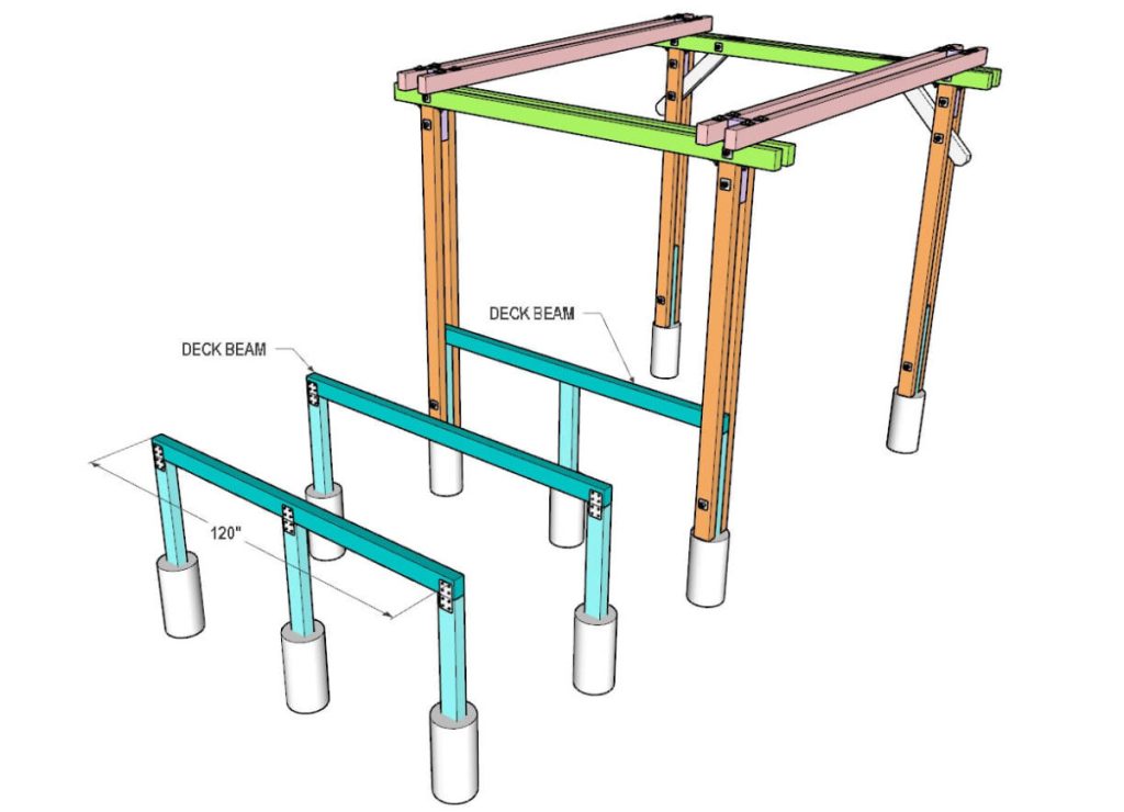Take 10-foot long 4×6 deck beams and place them on top of the posts as shown in the picture. Then using 8×4 metal strap plates or truss mending plates, secure the beams to the posts.