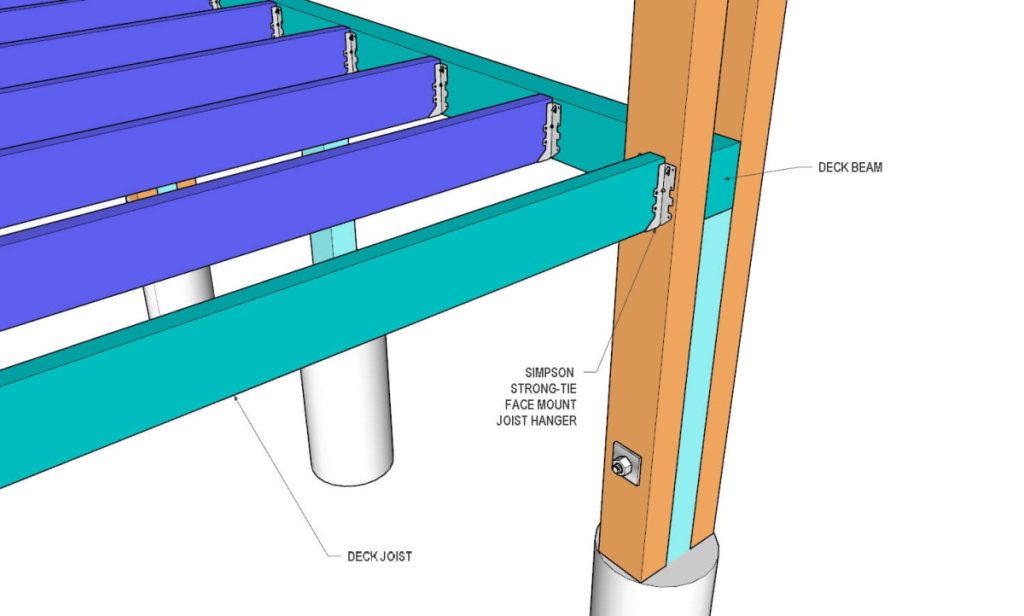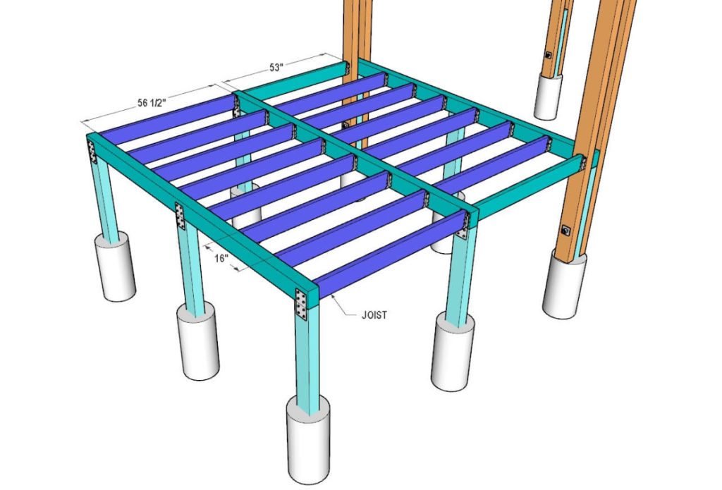 Take 2×6 and cut two joist boards to 53″ and fourteen boards to 56 1/2″ in length. The joist boards will need to be attached to the beams using Simpson Strong-Tie Face Mount Joist Hangers.