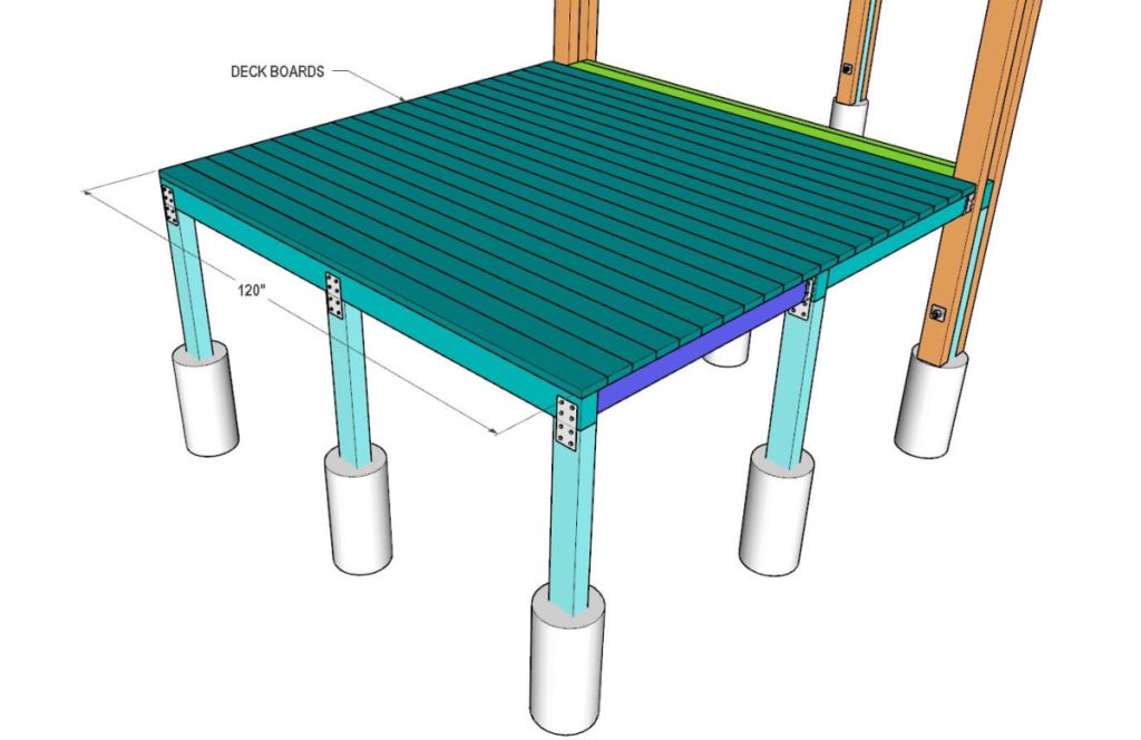 Now take ten-foot-long 2×6 deck boards and install them across the joist using wood screws. You will need to trim a few deck boards to go around the legs.