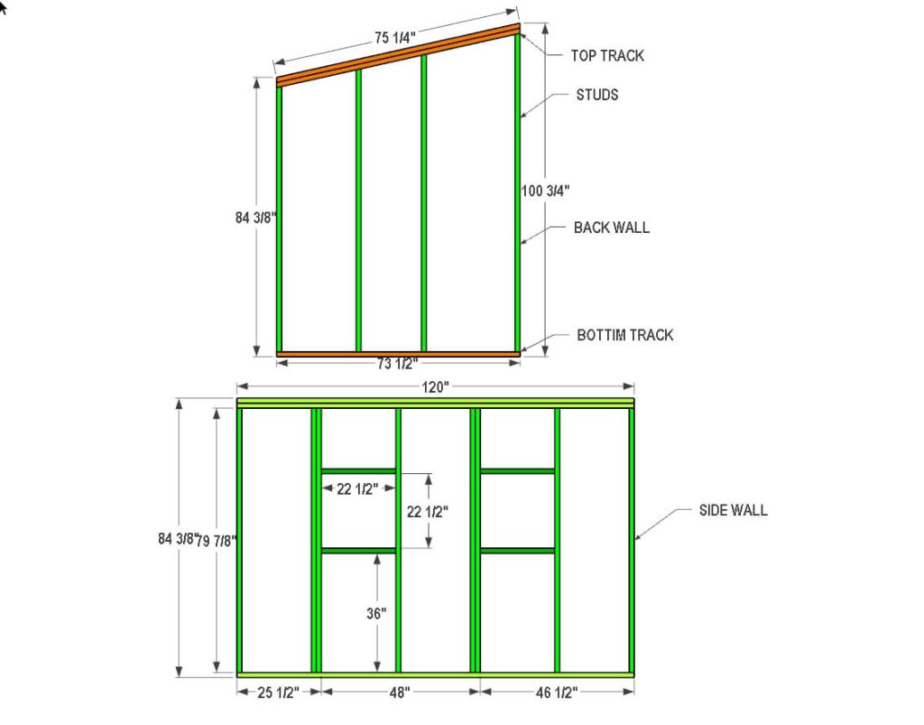 The side wall needs to be 10 feet long, so take one 2×4 that is 10 feet in length for the bottom track and two 2x4s for the top track. Then cut eight 2×4 studs to 79 7/8″ in length. Also, cut four boards to 22 1/2″ in length for the window. Assemble the wall as shown in the picture.