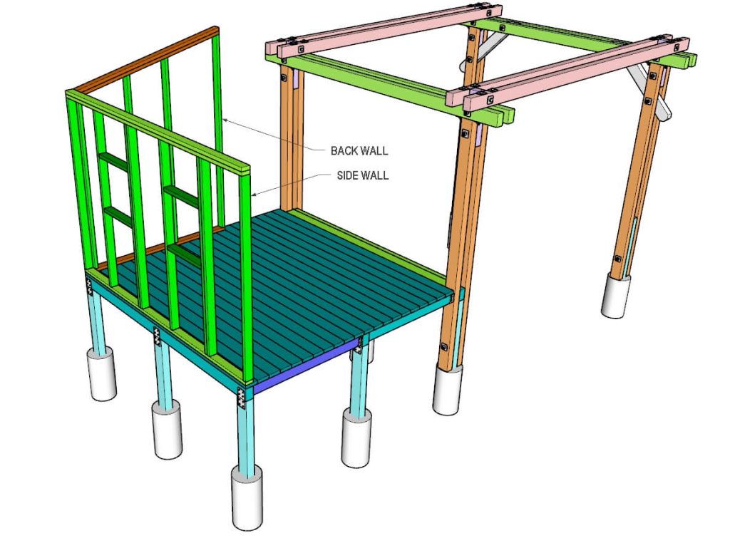 Once the walls are assembled, place them on the floor and attach them to the deck boards with wood screws or nails.