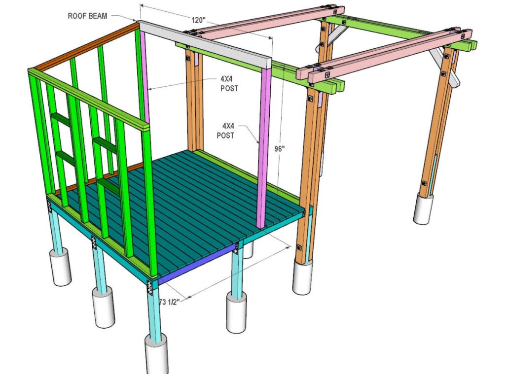 First, attach the back 4×4 post to the back wall and the deck with wood screws. Then place the front 4×4 post making sure that the distance from the wall to the post is the same for both, the back and front posts. Next, place and secure the roof beam to the 4×4 posts. You could use a metal strap or truss mending plates to connect the beam to the post, just like in step 8.