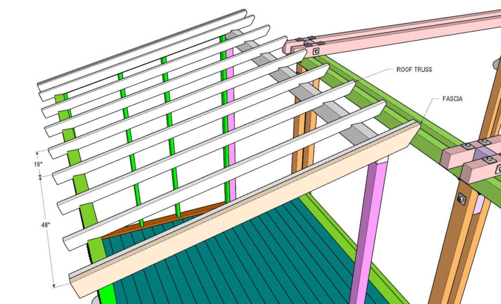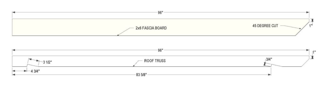 For the roof trusses, use 2×4 lumber. Then attach a 2×6 fascia board at the front and back of the roof trusses.