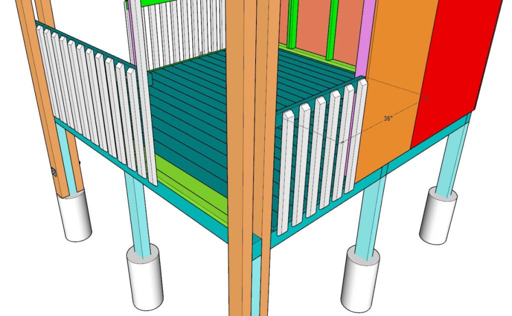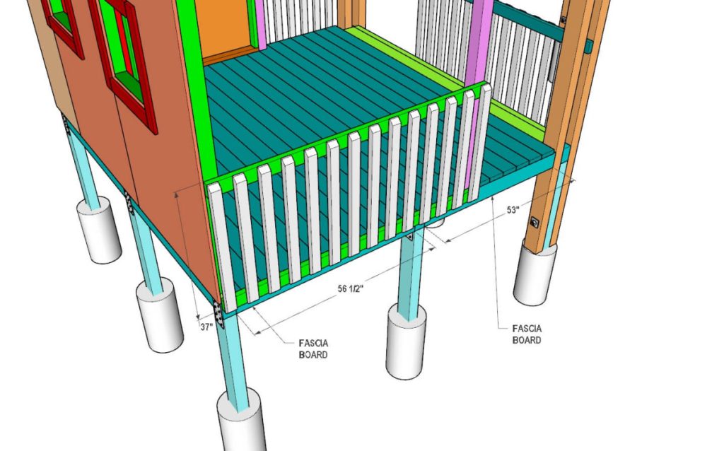 Before installing the fence, cut two 2×6 fascia boards to 56 1/2″ in length and two 2×6 boards to 53″. Attach these fascia boards to the joist in the front and back of the playhouse as shown in the picture. Then you will be able to attach the fence panel and the stairs to this fascia board.