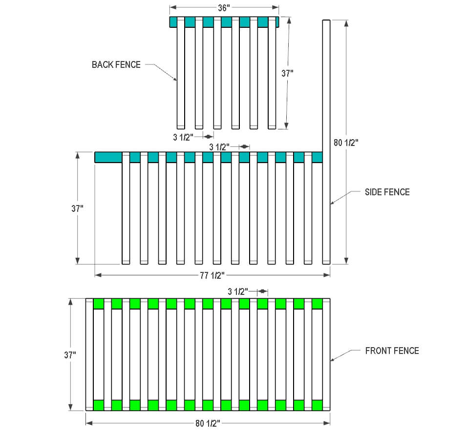 To build the front fence panel, take 2×4 lumber and cut two rail pieces to 80 1/2″ in length. Then take 2×3 lumber to cut 14 picket boards to 37″ in length. Trim the ends of the picket boards at 45 degrees, as shown in the picture.