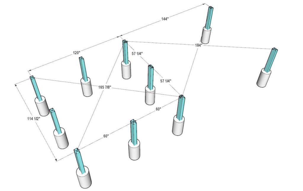 Using provided dimensions in the picture, roughly mark the centers of pier locations. Choose one corner as the home base and pull all dimensions from that location. Otherwise, your measurement will contain errors.