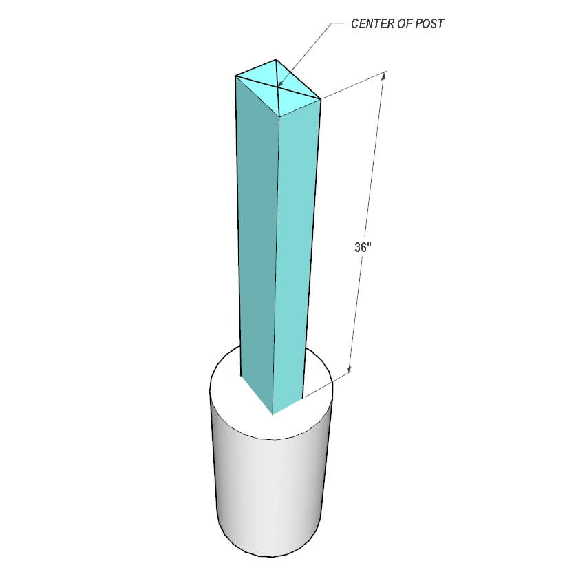 Draw an X on top of each post. This will show you the center of the board. Secure each post with cross braces so they do not move when pouring the concrete. Make sure the center of the board matches the dimensions provided in the picture. Also, check that the top of each post is at the same elevation.