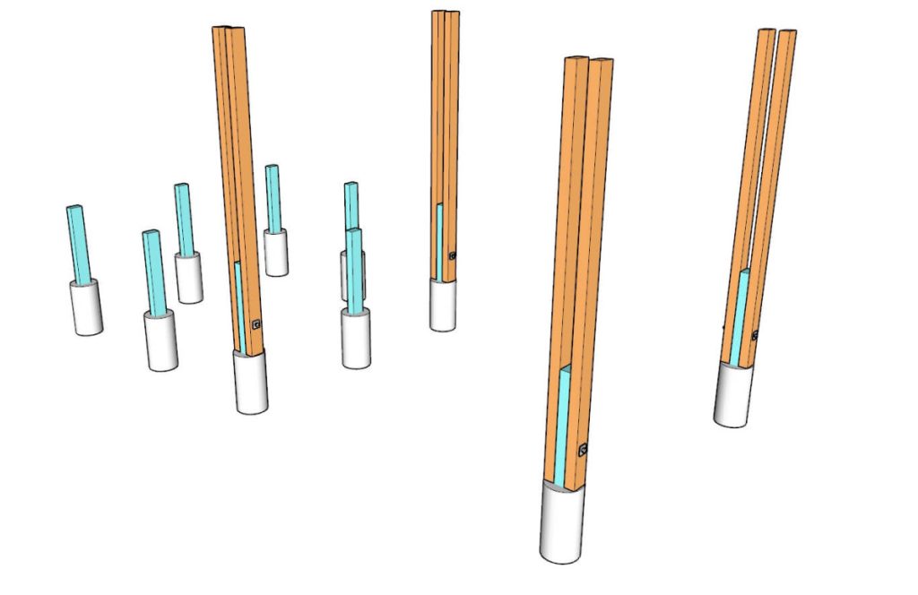 Take 4×6 pressure-treated lumber and cut six pieces to 48″ in length. Then insert them into the form tubes. The top of the post needs to be 24″ above the concrete tube.