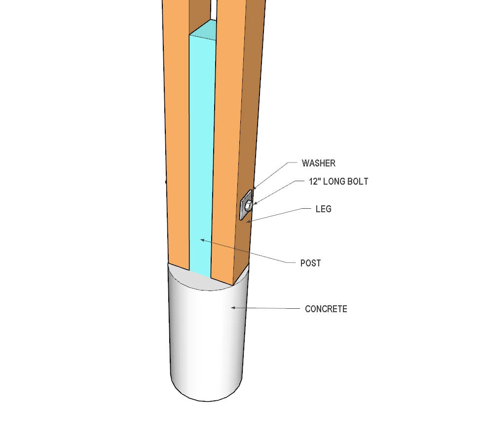 Place two legs on the top of the pier on both sides of the post. Then drill a 1/2″ hole through the legs and the post to insert the bolt. You will need to use 12″ long bolts to secure the legs. Make sure the bolts and nuts have washers on each side.