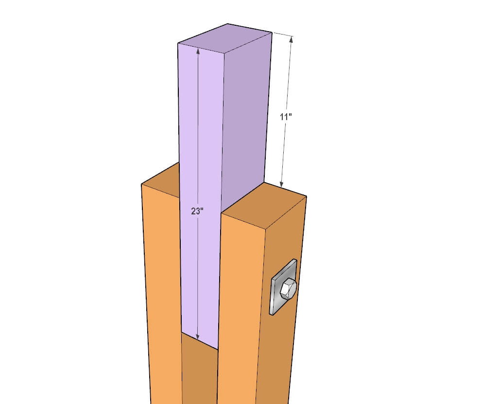 To join the top of the legs, take a 4×6 lumber and cut four pieces to 23″ in length. Insert this piece between the legs so it’s 11″ above the top of the leg. See picture.