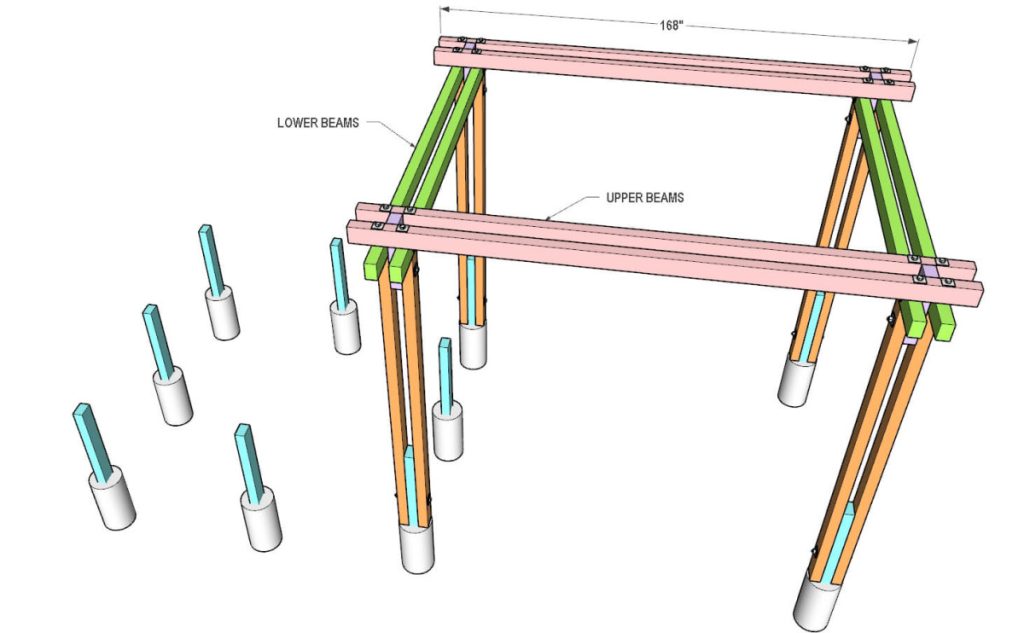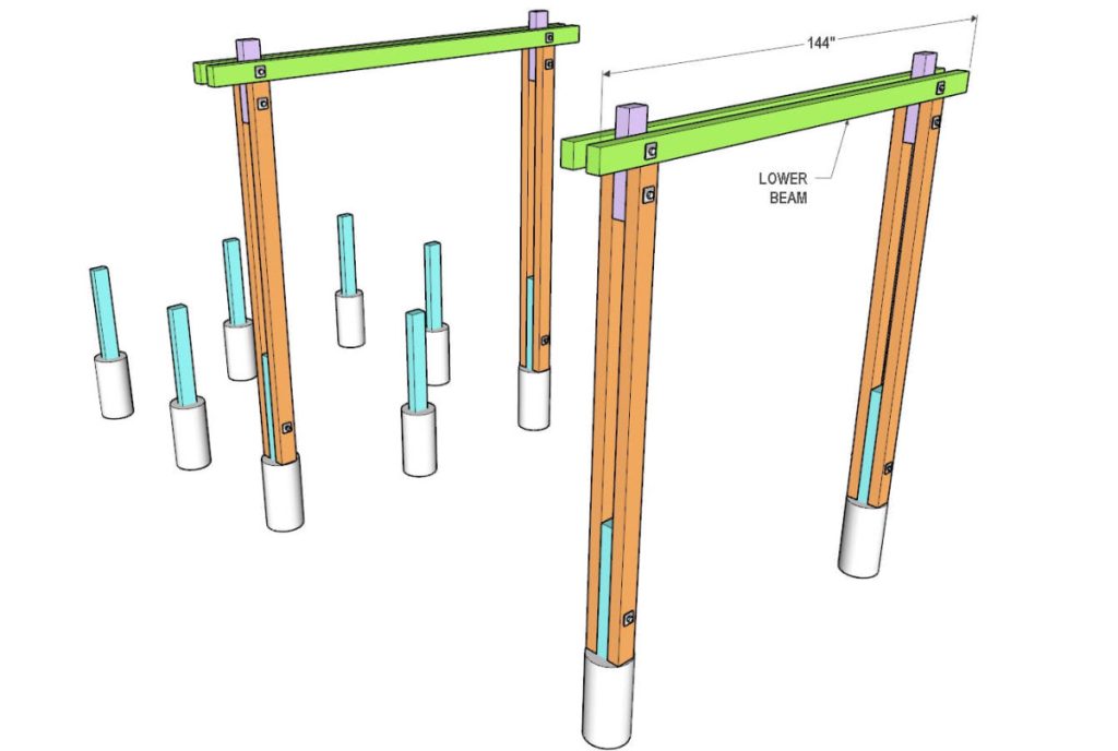 Take 4×6 lumber and cut four horizontal beams to 144″ in length. Then place them on top of the legs. Make sure these beams are centered between the legs. Then secure the beams to the 23″ long piece with a bolt and a nut.